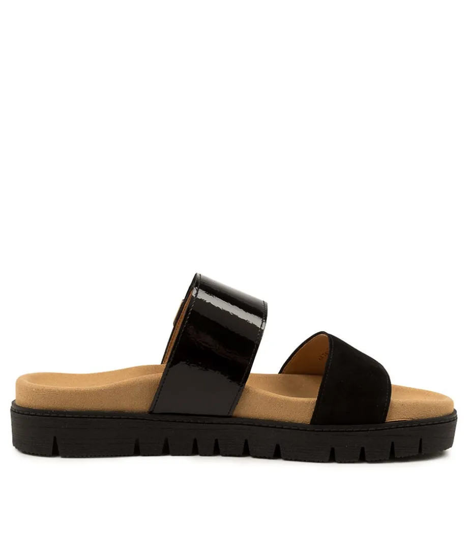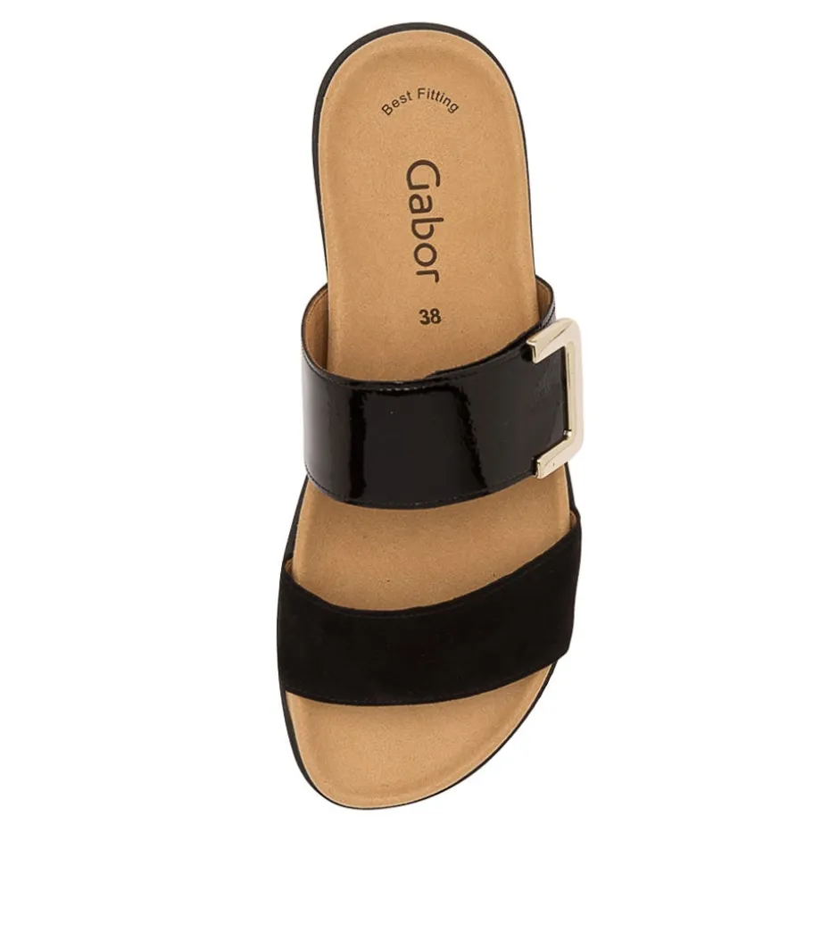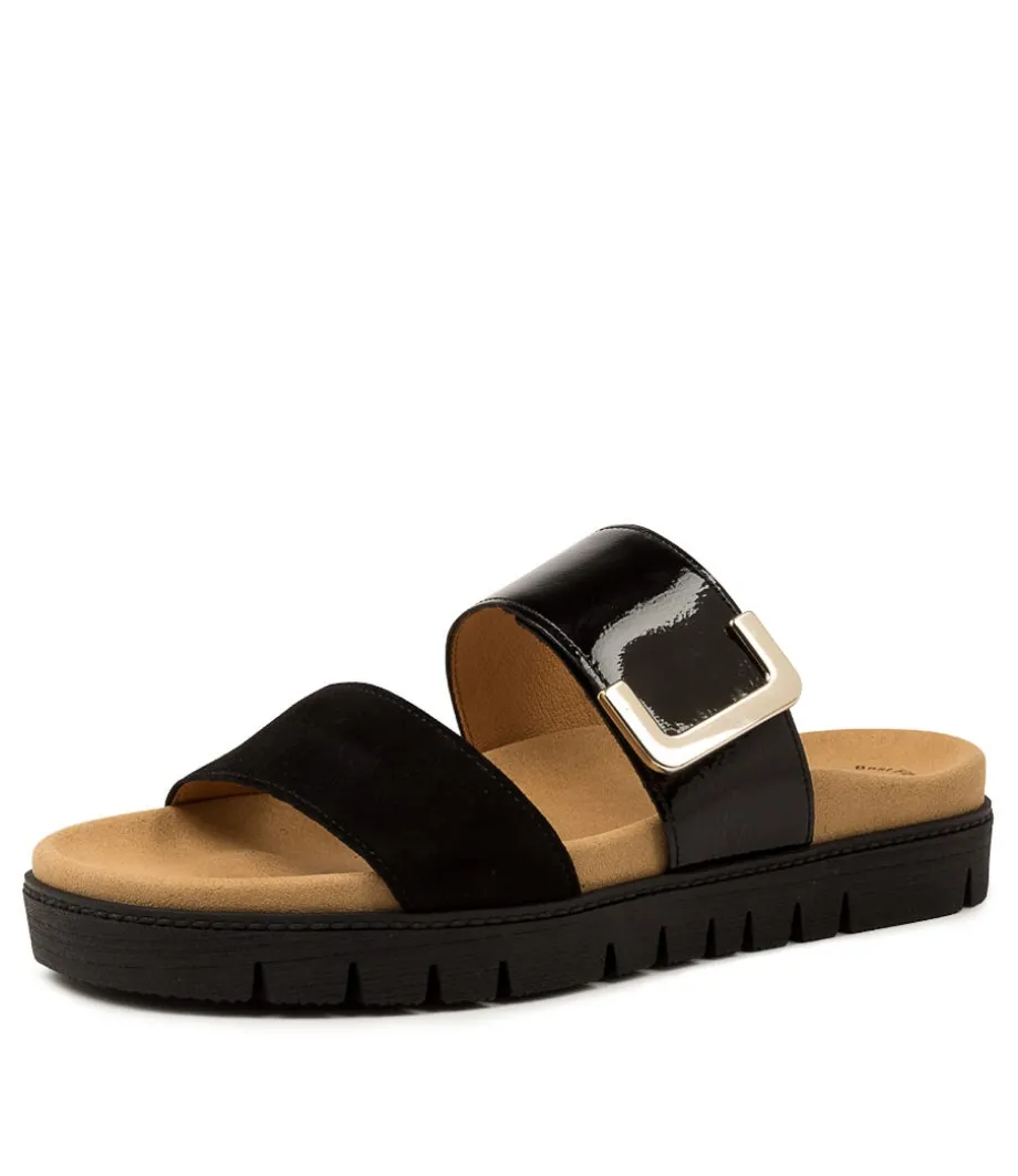 Whether Paired With An Embellished Caftan For Bayside Dining Or Styled Casually In Capris, The Harper Slide By German Comfort Label Gabor Offers Support And Style In Equal Measures, Crafted From Foiled Suede With A Buckle Accent, Adjustable Straps And Best Fitting Footbed Technology Atop A Flexible Notched Sole.